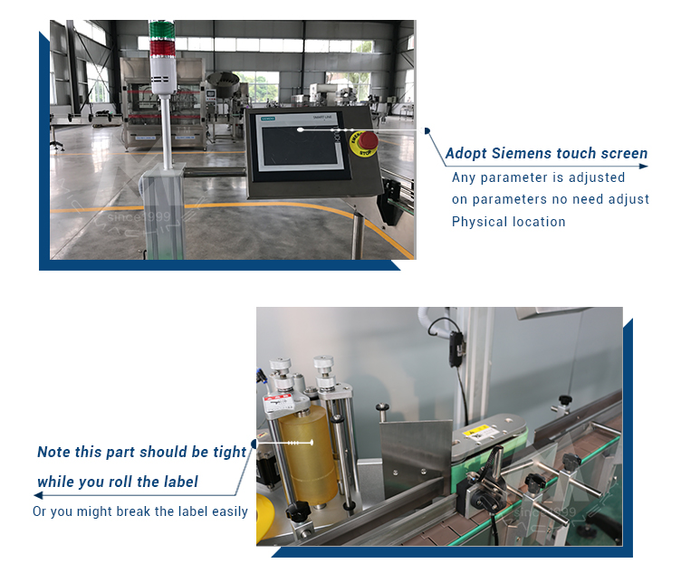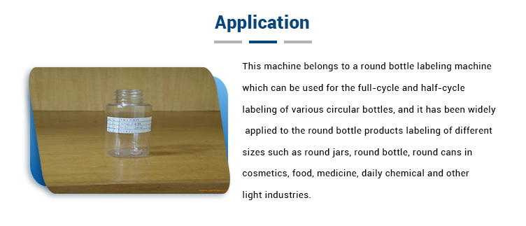 Denne maskinen tilhører en rund flaskemerkingsmaskin som kan brukes til helcyklus- og halvsyklusmerking av forskjellige sirkulære flasker, og den har blitt brukt mye på runde flaskeprodukter merking i forskjellige størrelser som runde krukker, rund flaske , runde bokser innen kosmetikk, mat, medisin, daglig kjemisk industri og annen lett industri. Utstyrssammensetning: Elektrisk skap, transportmekanisme, separat flaskeenhet, rullemerkeanordning, børsteetikettenhet, 1 # merkemotor, driftssystem og kontrollsystem.