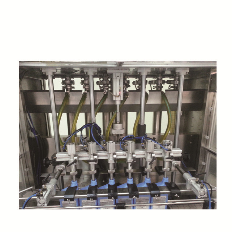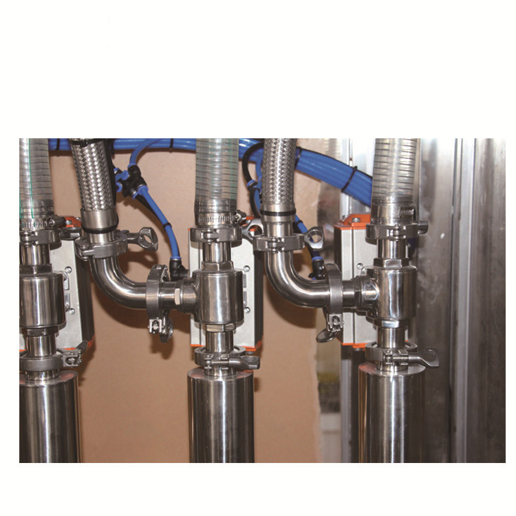 3. Det kan dekke behovet for høyere ytelse ved å ta i bruk to-skinne flaskefôring, to-skinns fylling og to-dyserhette skruing eller rulle eller presse. Denne maskinen har høy påfyllingsnøyaktighet og kan demonteres og steriliseres på en enkel måte, ved å bruke hurtigledd rustfritt stålpistongpumpe. Med bruk av konstant skruing av dreiemomenthette og pneumatisk beskytter, er den tette munnen lekkasjesikker.